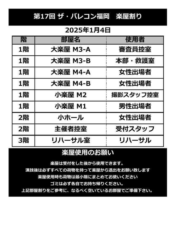 ・楽屋・リハーサル室が混みあう場合は係からお声かけをし、出場する順番が早い方を優先とし、 ご移動をお願いする場合がありますので、ご協力よろしくお願いいたします。